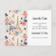 Wedding (or other) save the date postcard with a lovely French themed pattern. Pretty flowers and an Eiffel tower and butterflies. Colours include pink, blue, peach and cream.