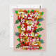 This is a colourful typography design of a Bible verse from the Gospel according to St. Matthew. This verse tells us to lift up all our burdens to God and He will help us carry them. The Biblical passage is written in an artistic lettering style and are in white. Behind the words are flowers of different sizes and shapes and are coloured with red, orange, and orange yellow. There are also leaves in different shapes and sizes and are in shades of green.