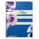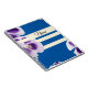 Beautiful design with purple flowers and blue background with white lines plus place for your name and custom text.