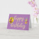 A feminine lavender-purple coloured birthday greeting card for women. This card features a bouquet of watercolor flowers, pansies, and a stack of cute teacups.