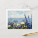 A soft coastal floral painting in light pastels, featuring purple, blue, and white flowers with delicate greenery and a tranquil sea view in the distance, perfect for cottagecore or coastal style homes.