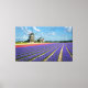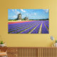 Canvas landscape print of purple and pink hyacinth flowers and three windmills in the Bulb Region in the Netherlands.