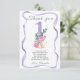 Birthday invitation card featuring watercolor illustration of number one with wild flowers and purple ribbon.
