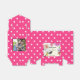 Bright pink and white polka dots are all over the favour box. A picture of the couple on the back. Replace it with your picture. Use the crop tool to make it fit in the square. The same design image used for the wedding invitation is on the front of the box. This has the couple's name and date. This is completely customisable. Add your wedding information or other special event. Change the font, and adjust the size and location. Matching products are available or transfer this design for other products. All images can be changed and taken off to create your special favour box.