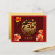 Design with traditional Chinese floral decoration + Chinese lanterns + golden Tiger paper-cut in central position with a branch of peach tree + "Happy New Year" in English and Chinese. Design on horizontal holiday postcard. Matching greeting card.