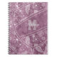 This pretty volleyball themed notebook journal for girls with a distressed look, monochromatic plum colour theme features the outline image of a simple, abstractly oversized volleyball on the front cover - a doodle pattern of paislies, flowers and feathers in white covers all but one of the volleyball's panels - personalise with the athlete's name and monogram, varsity letter or jersey number - by katz_d_zynes