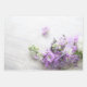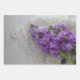 Purple stock flowers on faded-back old music or lace, a pretty choice for bridal shower or wedding gifts