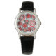 This watch has a design of rings and circles in shades of red with black lines crossing behind them forming flowers on a field of white.