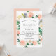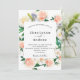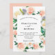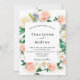 A trendy floral wedding invitation in white, rose gold and blush pink. A chic white background on the front. Decorated with large, lush watercolored flowers, florals in white, rose gold, blush pink with some greenery. Personalise and add your names and wedding details. Black text.