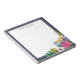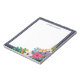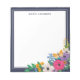 Lovely personalised notepad with your name in modern dark blue letters. In the bottom right corner, flowers in white, hot pink, purple, and yellow grow along with greenery and berries. A yellow butterfly sits atop a purple rose. The floral notepad has a dark blue border.