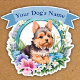 Flowery Blue Ribbon Cute Yorkshire Custom Sticker, a delightful and personalised creation designed for women and girls who have a special fondness for Yorkshire dogs and the timeless allure of flowers. This charming sticker showcases an endearing Yorkshire dog, ensconced within a beautiful flowery frame adorned with delicate lilies, and elegantly accentuated by a graceful blue ribbon where you can proudly showcase your beloved pet's name.