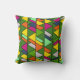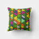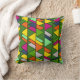 This throw pillow has a mid-century modern design of overlapping triangles in flowery colors running vertically on a field of green.