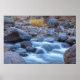 A tranquil stream flows over smooth, grey rocks in a serene forest setting. The water is captured in a long exposure, creating a silky, ethereal effect. The stream is surrounded by a bed of smaller rocks and pebbles, and a few trees and bushes line the banks. The scene is bathed in soft, natural light, casting a calming and peaceful atmosphere.