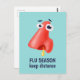 Flu season postcard with a funny illustration of a red runny nose character with a snot and the customisable text "Flu season - keep distance" over cheerful blue background. This funny button will appeal to someone who likes silly stuff and appreciates health humour.