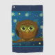 Adorable fluffy brown owl sitting on a branch of a tree. The background is a night sky full of bright yellow stars. The owl in the foreground watches the night away with his big round staring yellow eyes. Clinging onto the branch with his little brown claws. Beautiful digital artwork by C.Katt ideal for animal or bird lovers with a special love for owls.