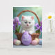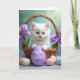 On the front of the card a fluffy snow-white kitten with bright blue eyes sits snugly in a rustic woven basket, gazing forward with a gentle, affectionate look that feels like a quiet hello between close friends. Its small paws rest on a smooth lavender egg centred in the basket, and the egg carries a short “first” milestone message in neat lettering. Around the kitten, purple tulips and soft bows tuck into the weave, adding springtime colour and a tender, romantic touch like a bouquet placed just for someone special 🌷. The lighting is soft and diffused, giving the fur a glowing edge and keeping the scene calm and cosy. Behind the basket, the background fades into a blurred wash of teal and fresh greens, suggesting an outdoor garden without showing any sharp details. In the lower area, several pastel eggs are scattered across the foreground, some decorated with tiny star shapes and others marked with fine crack-like patterns that look carefully drawn. The greeting text sits above the main image in a light purple tone, while the “first” message appears on the lavender egg near the centre 🐰.