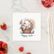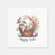 Easter paper napkins featuring a fluffy white lamb sitting inside a woven basket, surrounded by colourful Easter eggs. The eggs are painted in vibrant hues. Flowers and leaves adorn the top edge, creating a festive and cheerful scene.