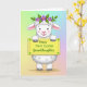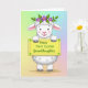 This card shows a fluffy white, lamb-like creature centered against a softly blended pastel background, with round eyes and a faint smile that feels like it’s meant for someone dear 🌷. A light blush on its cheeks and the gentle tilt of its head give it a sweet, affectionate look, like it’s posing for a loved one. Resting on its head is a small crown of purple flowers with green leaves, adding a springtime touch. In its front paws, it holds a rectangular yellow sign with slightly wavy edges, like a cozy little placard. Small green starburst shapes sit near the corners of the sign, adding extra detail without crowding the design. Across the middle of the yellow sign, the message “Happy First Easter Granddaughter” appears in green lettering, centered and easy to read 🐰. Behind it all, the backdrop fades from pale greens and blues near the top into soft pinks and purples toward the bottom.