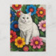 White fluffy cat sitting in a patch of colourful folk art flowers. Cute cat themed greeting postcard for cat lovers to say hi to friends or family members.