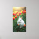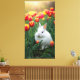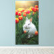 fluffy white rabbit sits among the tulips canvas print