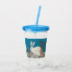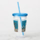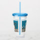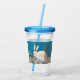 This acrylic drink tumbler with straw and lid has a fluffy white rabbit sitting on the ground among white and orange flowers on a blue background.