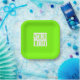 Branded square paper plates in a vibrant fluorescent green. In the centre is a large cover logo. Personalise this item immediately. Alma Wad's design is stylish and modern.