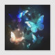 Fabulous, glowing, blue and yellow, night butterfly on dark background.