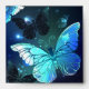 Fabulous, glowing, blue and yellow, night butterfly on dark background.