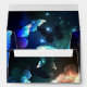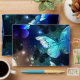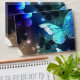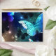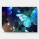 Fabulous, glowing, blue and yellow, night butterfly on dark background.