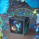 Fabulous, glowing, blue and yellow, night butterfly on dark background.