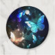Fabulous, glowing, blue and yellow, night butterfly on dark background.