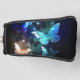 Fabulous, glowing, blue and yellow, night butterfly on dark background.