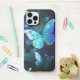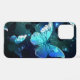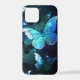 Fabulous, glowing, blue and yellow, night butterfly on dark background.