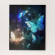 Fabulous, glowing, blue and yellow, night butterfly on dark background.
