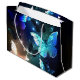 Fabulous, glowing, blue and yellow, night butterfly on dark background.