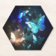 Fabulous, glowing, blue and yellow, night butterfly on dark background.