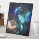 Fabulous, glowing, blue and yellow, night butterfly on dark background.