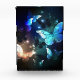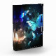 Fabulous, glowing, blue and yellow, night butterfly on dark background.