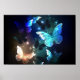 Fabulous, glowing, blue and yellow, night butterfly on dark background.