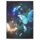 Fabulous, glowing, blue and yellow, night butterfly on dark background.