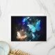Fabulous, glowing, blue and yellow, night butterfly on dark background.