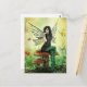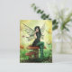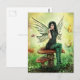 Fantasy card with a cute forest fairy sitting on a fly agaric.