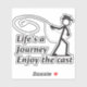 This sticker features a stick figure guy engaged in fly fishing, expertly casting a nymph into the water. The simple, playful design captures the essence of the angler's stance and the graceful arc of the fishing line, making it perfect for outdoor enthusiasts and fly fishing fans alike.