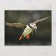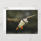 Animal card showing a flying atlantic puffin on skomer island (Wales) with sand eels in beak to feed the chicks. The Atlantic puffin (Fratercula arctica), also known as the common puffin, is a species of seabird in the auk family. It is the only puffin native to the Atlantic Ocean. The Atlantic puffin has a black crown and back, pale grey cheek patches and white underparts. Its broad, boldly marked red and black beak and orange legs contrast with its plumage. It moults while at sea in the winter and some of the bright-coloured facial characteristics are lost. The Atlantic puffin breeds in Iceland, Norway, Greenland, Newfoundland and many North Atlantic islands, and as far south as Maine in the west and the British Isles in the east. The Atlantic puffin has a large population and a wide range. It is not considered to be endangered although there may be local declines in numbers. On land, it has the typical upright stance of an auk. At sea, they swim on the surface and feed mainly on small fish, which they catch by diving underwater, using their wings for propulsion.