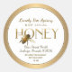 HONEY is written in a Metallic Gold font. Flying bee. Gold Border.
