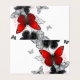 Flock of flying, realistic, red and black morpho butterflies on white background with drops of paint.