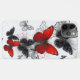 Flock of flying, realistic, red and black morpho butterflies on white background with drops of paint.