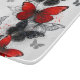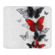 Flock of flying, realistic, red and black morpho butterflies on white background with drops of paint.