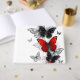 Flock of flying, realistic, red and black morpho butterflies on white background with drops of paint.