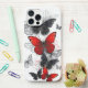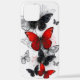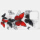 Flock of flying, realistic, red and black morpho butterflies on white background with drops of paint.